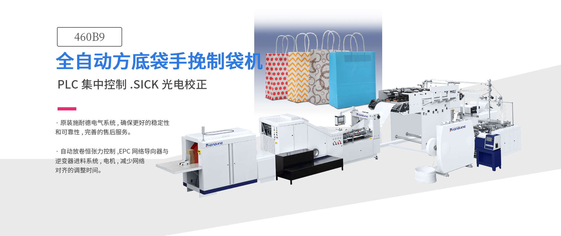 全自動(dòng)手提紙袋機(jī)以其優(yōu)異的品質(zhì)和性能獲得了全世界用戶的認(rèn)可。本機(jī)用于生產(chǎn)帶手提把的方底紙袋,是由手挽機(jī)將卷繩和貼片卷筒紙制成手把,通過輸送裝置將手挽送至貼把機(jī)組,貼把機(jī)組將原色或印刷好的卷筒紙進(jìn)行貼片位點(diǎn)斷、貼片位涂膠、自動(dòng)粘貼手把,再由主機(jī)將貼有手把的紙張進(jìn)行涂邊膠、成紙筒、切斷、底部壓痕、底部涂膠、袋底成形并輸送出袋,整個(gè)制袋過程一次同步完成。是生產(chǎn)手提